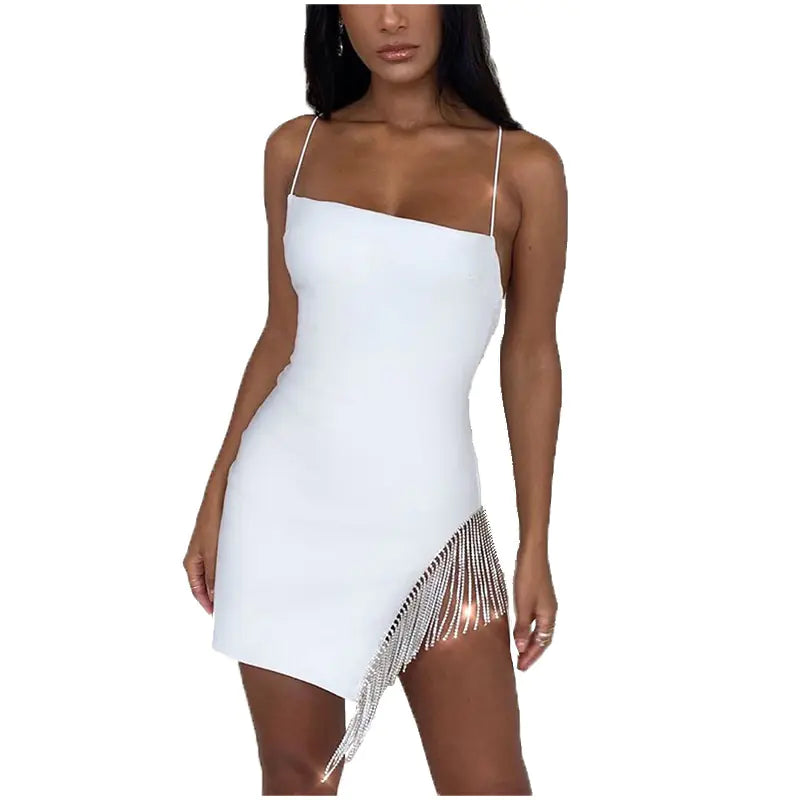 Get ready to steal the spotlight with this stunning fringe party short dress, adorned with dazzling rhinestones that catch the light with every move. Crafted from high-quality polyester fiber, this dress not only feels luxurious against your skin but also offers a chic and stylish look that is perfect for any night out.